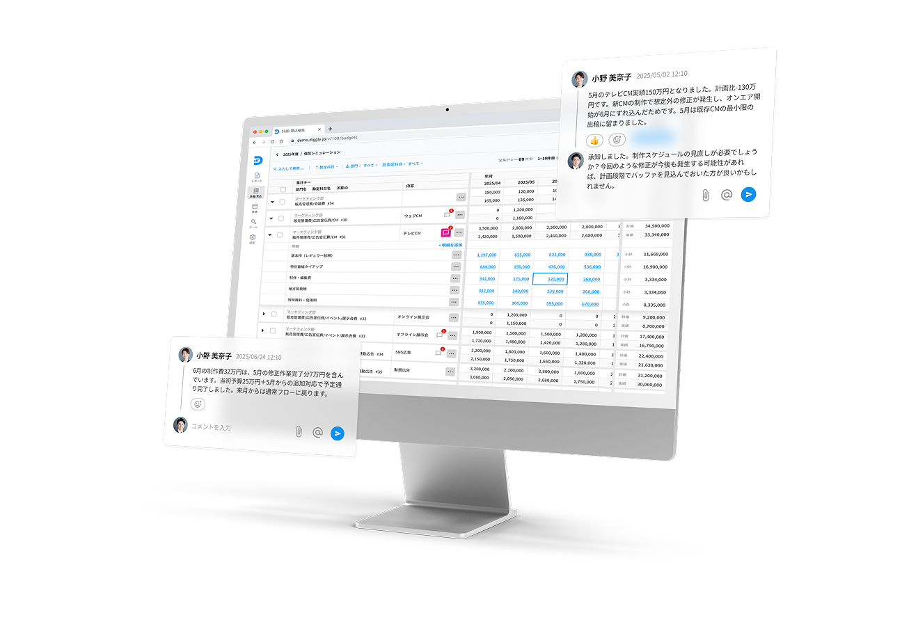 予算や見込、月次レポートの画面で、数値の根拠や理由に関するコメントや資料添付ができ、都度確認の手間を省きます