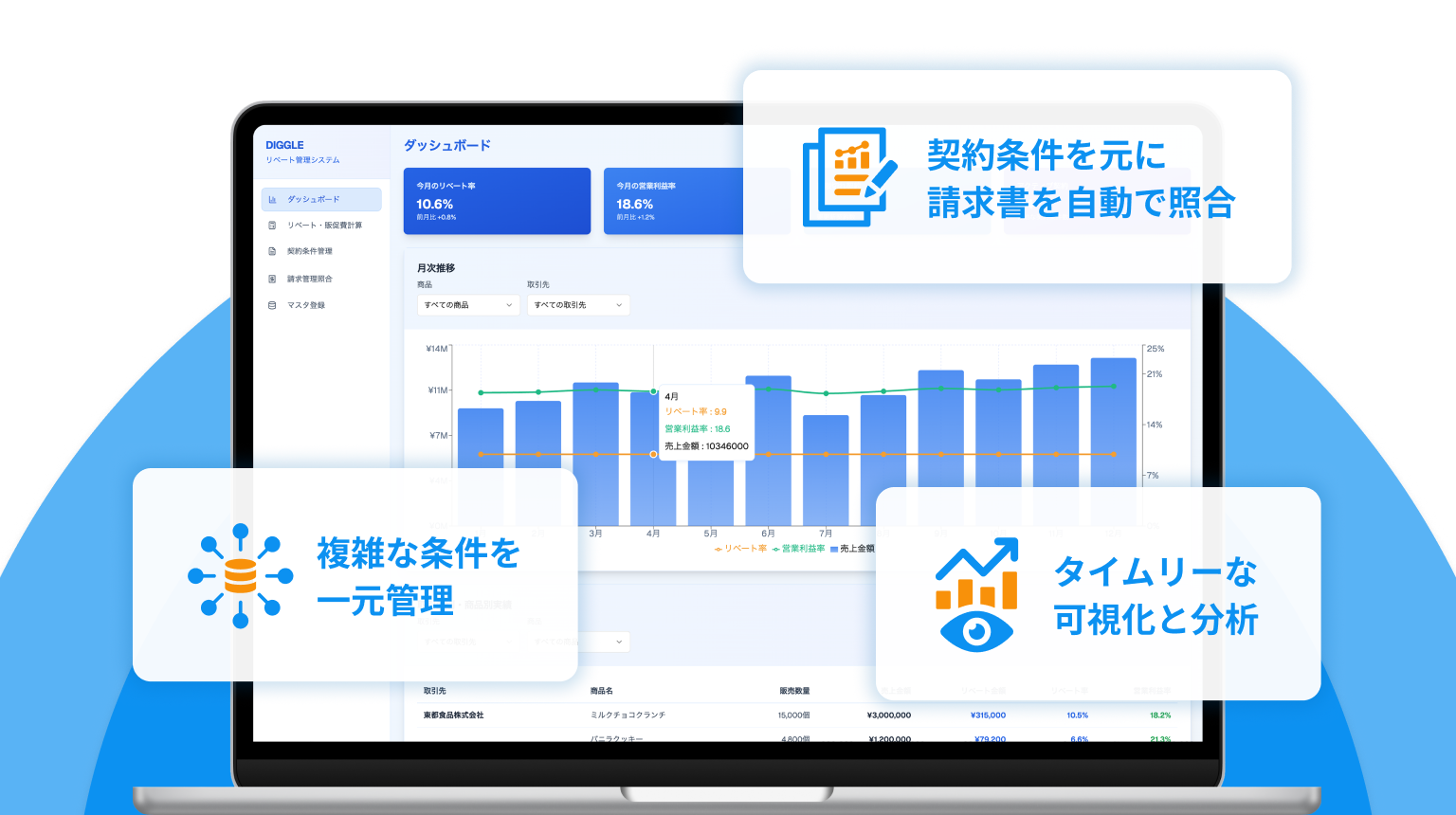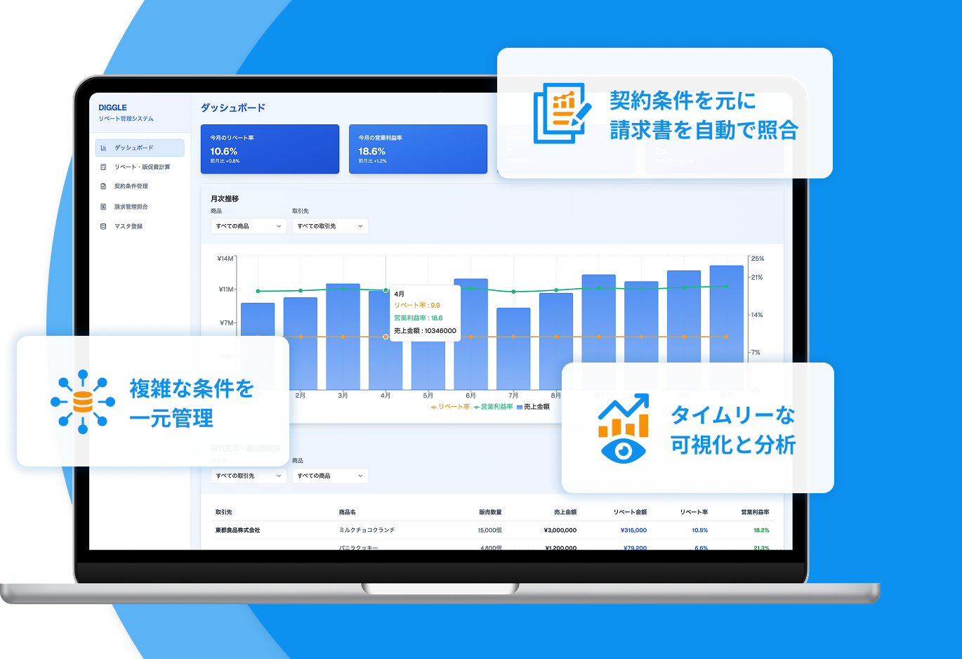 販売実績や契約条件をすぐに確認でき、販売実績を元にしたリベート計算結果と請求書金額が一致しているか自動でチェックする請求書照合機能も実装。